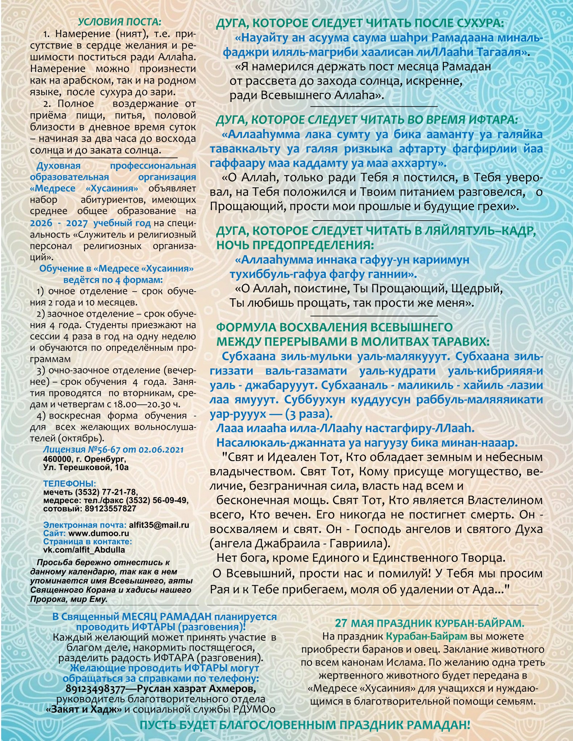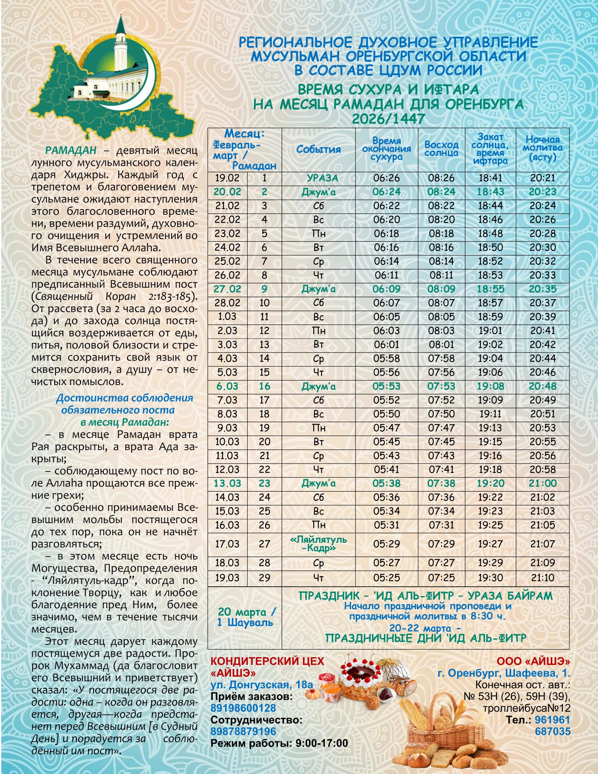 Календарь Регионального духовного управления мусульман Оренбургской области на месяц Рамадан 2026