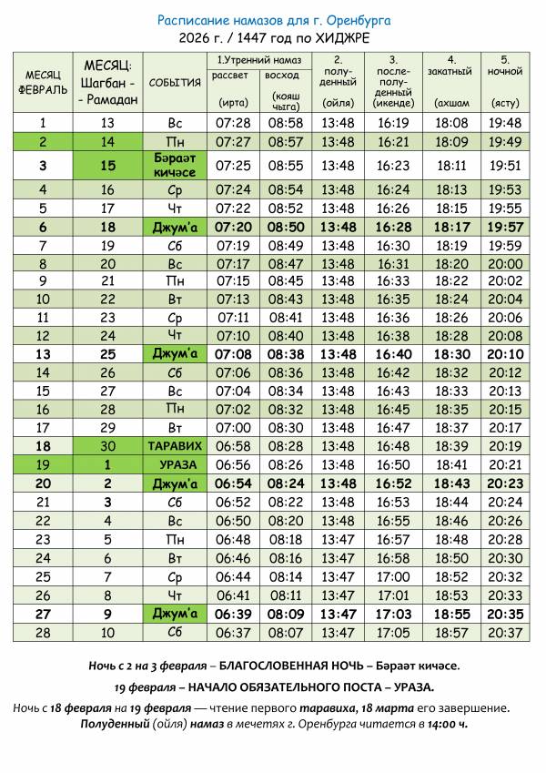 Календарь Регионального духовного управления мусульман Оренбургской области на месяц Рамадан 2026