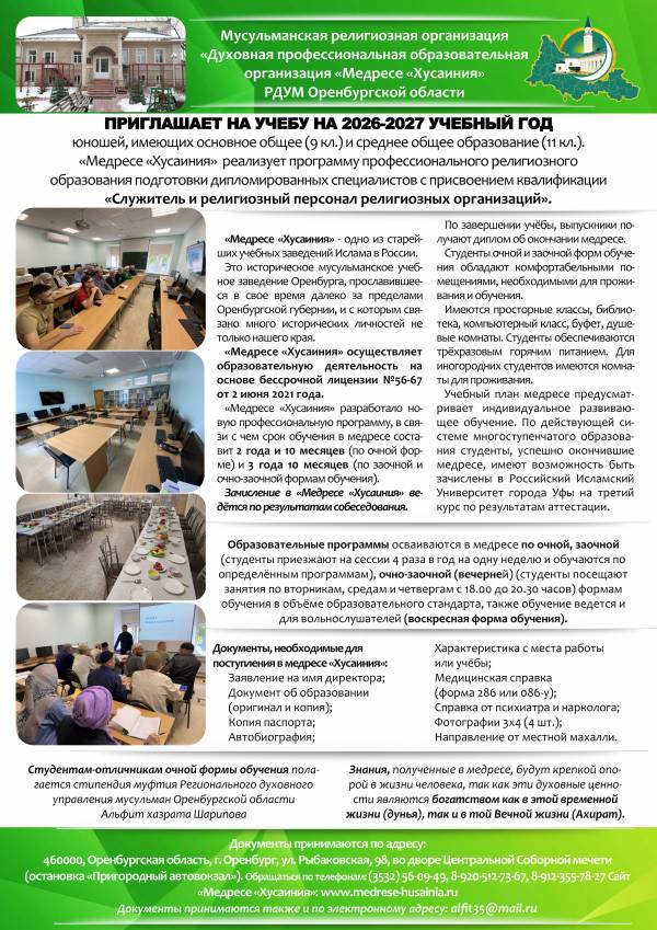 Мусульманская религиозная организация "Духовная профессиональная организация "Медресе "Хусаиния" Оренбурга ЦДУМ России, раелизует программу профессионального религиозного образования подготовки дипломированных специалистов на 2026-2027 учебный год.