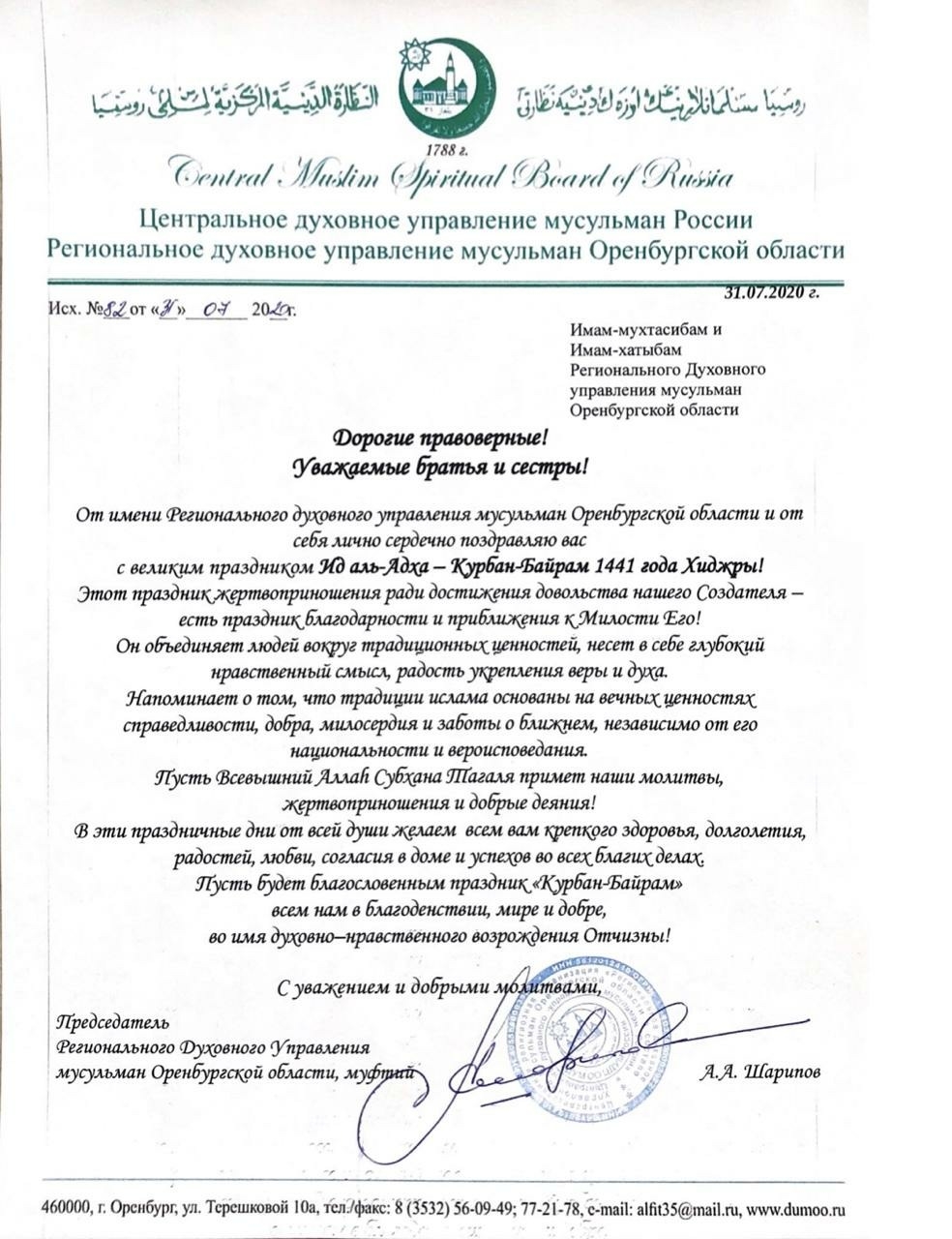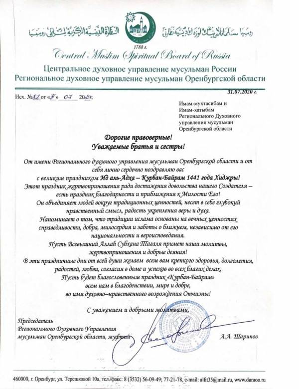 Председатель РДУМОо, муфтий Альфит хазрат Шарипов поздравил верующих с праздником Ид аль-Адха - Курбан-Байрам 1441 года Хиджры!