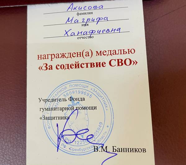 Студентка "Медресе "Хусаиния" города Оренбурга награждена медалью "За содействие СВО"